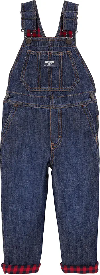 OSHKOSH B'GOSH Baby Boys' World's Best Overalls (18-30 in. inseam, 0.8 lbs) in denim with adjustable straps and snap closures. Sizes 0M-5T, blue or hickory stripe. Machine-washable cotton blend for daily play. 1-year warranty.