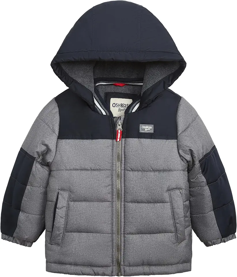 OSHKOSH B'GOSH Boys' Puffer Jacket (24-30 in. length, 1.2 lbs) in grey or blue with fleece lining and hood. Sizes 2T-5T, water-resistant polyester. Zipper closure, machine-washable. 1-year warranty.